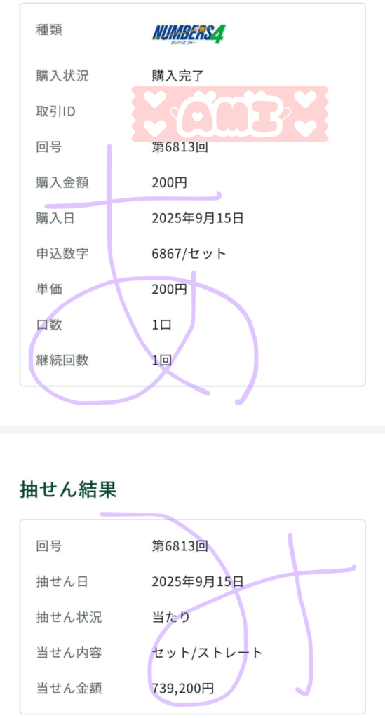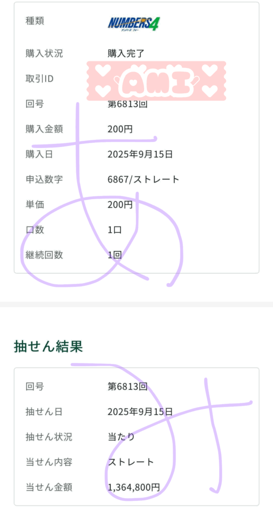 ナンバーズ4ストレート 1,364,800円 的中🎯