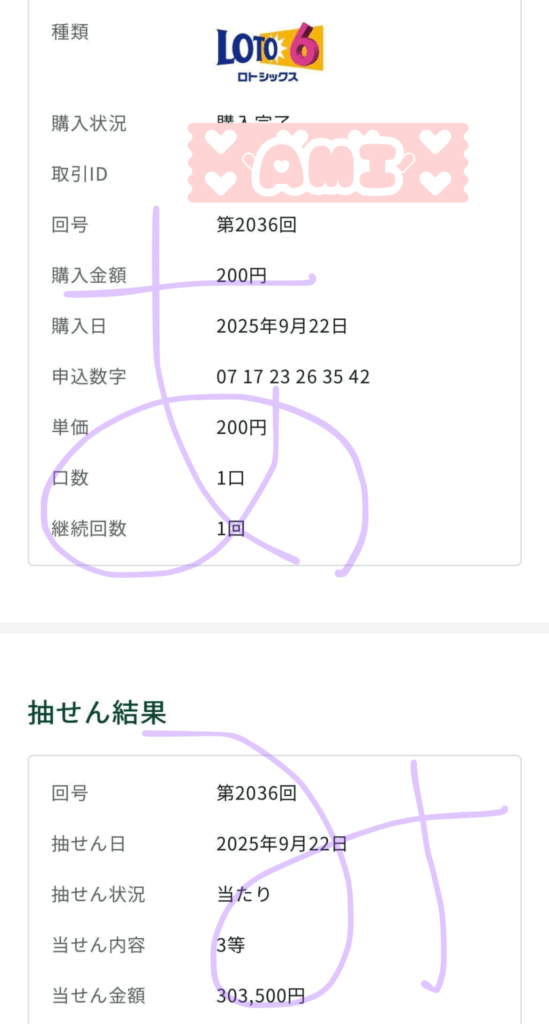 ロト6 3等 303,500円 的中🎯