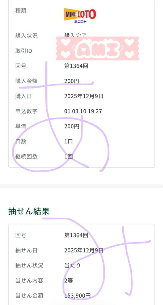 ミニロト2等 153,900円 的中🎯